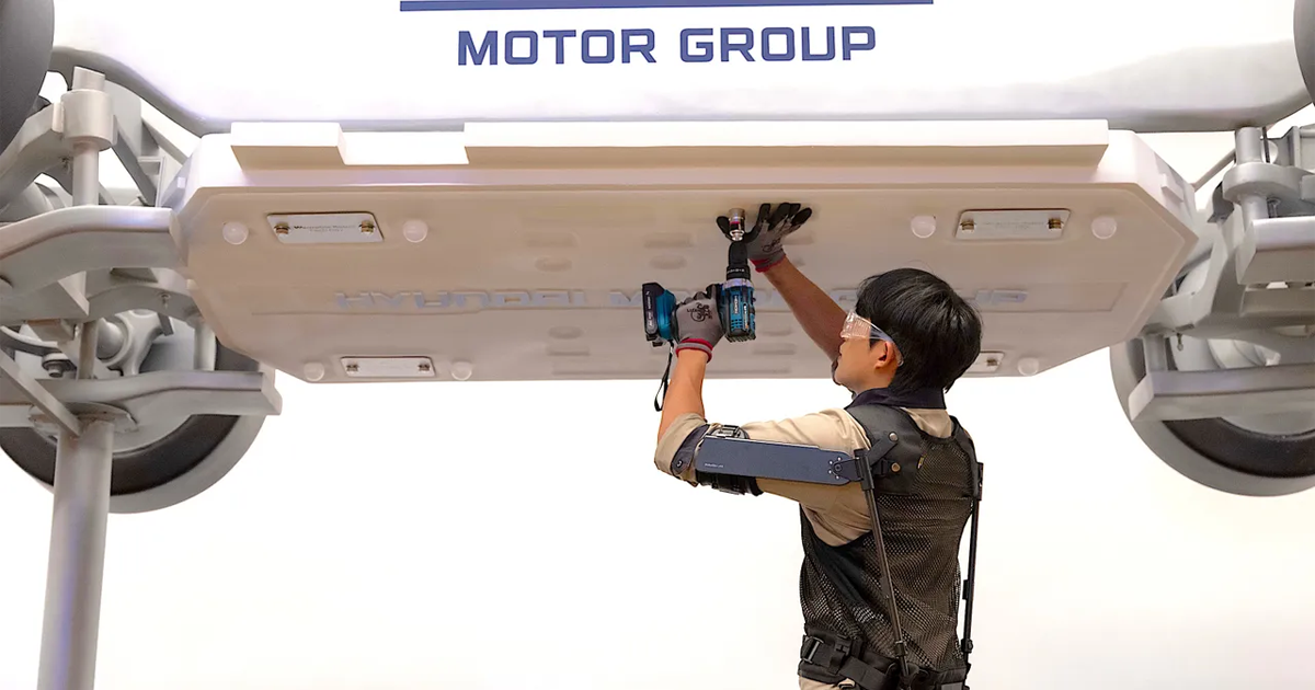 자동차 조립라인에서 머리 위로 물건을 들어 올리거나 반복적인 작업을 수행하는 작업자에게 로봇 지원을 제공하는 현대자동차의 X-ble Shoulder 같은
